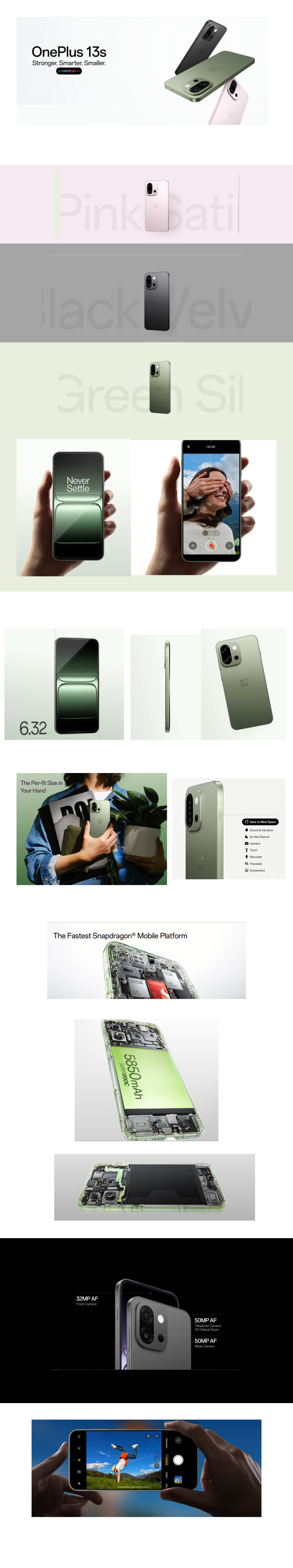 The OnePlus 13S is a flagship smartphone that combines cutting-edge technology with elegant design. Featuring a high-refresh-rate AMOLED display, it delivers crisp visuals and smooth scrolling for gaming, videos, and daily tasks. Powered by the latest processor and ample RAM, the OnePlus 13S ensures fast performance and efficient multitasking, making it ideal for both work and entertainment. Its advanced camera system captures stunning photos and videos, even in low-light conditions, while the long-lasting battery keeps you connected throughout the day.
