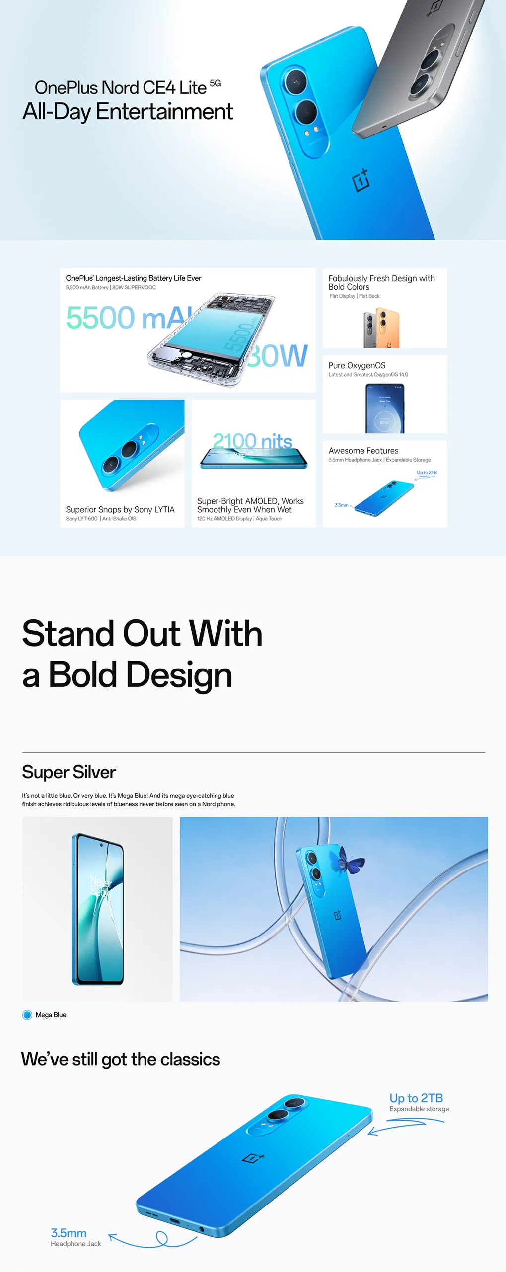 The OnePlus Nord CE4 Lite 5G is a high-value smartphone designed for users who prioritise a brilliant display and class-leading battery life. Featuring a 6.67-inch 120 Hz AMOLED Sunlight Display with a peak brightness of 2,100 nits, this device ensures perfect visibility even under the harsh midday sun in the UAE. Powered by a reliable 5G chipset and a massive 5,500mAh battery, the Nord CE4 Lite is built for uninterrupted streaming, browsing, and multitasking. Whether you are looking for the striking Mega Blue or the elegant Super Silver, we offer the most competitive OnePlus Nord CE4 Lite price in Dubai, UAE, paired with lightning-fast delivery to your doorstep.